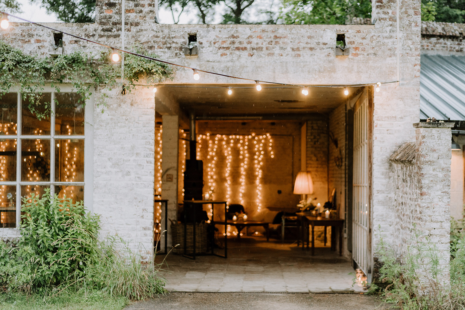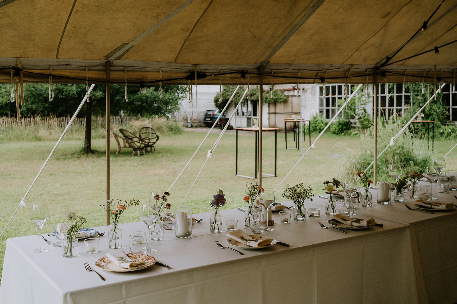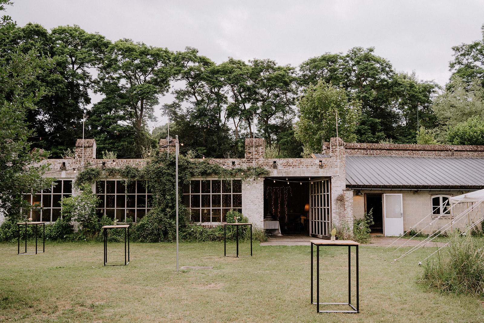 Nina en Johan droomden van een echt midzomerfeest of Midsommar. Denk aan een gezellig tuinfeest met kampvuur, wilde bloemen en eindeloos lang tafelen in de zachte schemering. Hun trouwlocatie,Tombeek Plage & Ateliers, leent zich hier perfect voor: een grote tuin vol hoekjes en kantjes waar je heerlijk kan wandelen, met knoestige appelbomen en een echte vuurplaats. Helaas werkte het Belgische weer niet mee op de dag zelf. Hierdoor moesten we de geplande buitenceremonie last minute verplaatsen naar het industriële atelier binnen. Gelukkig is het daar minstens even sfeervol!