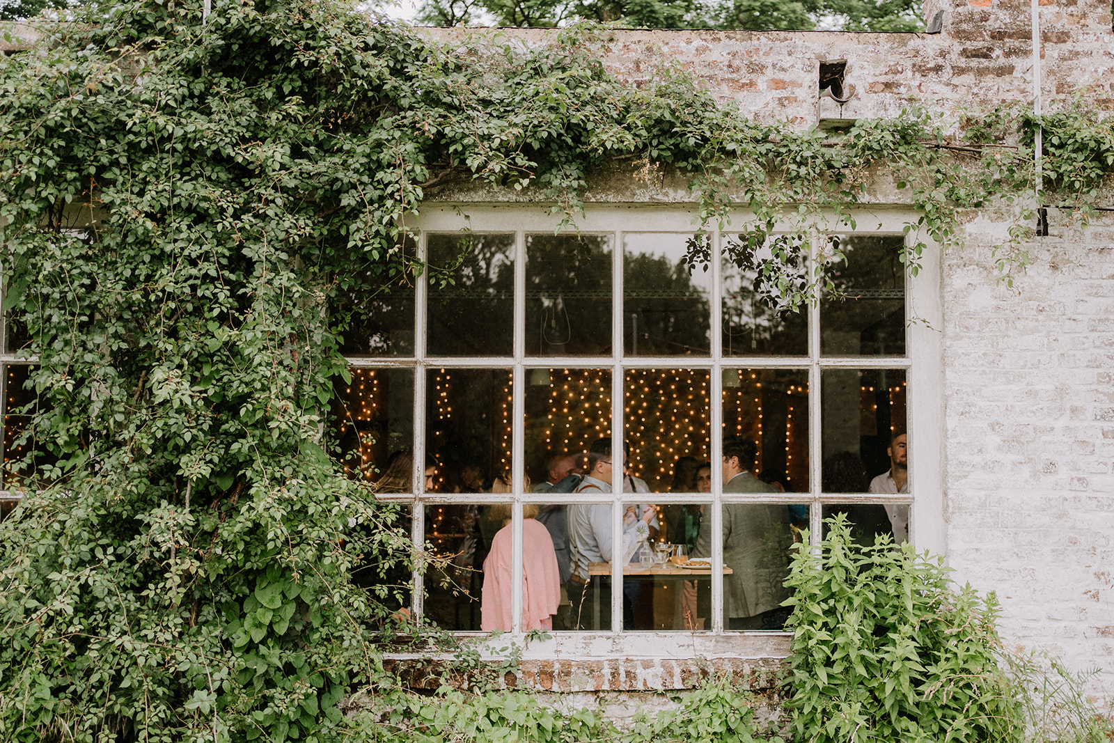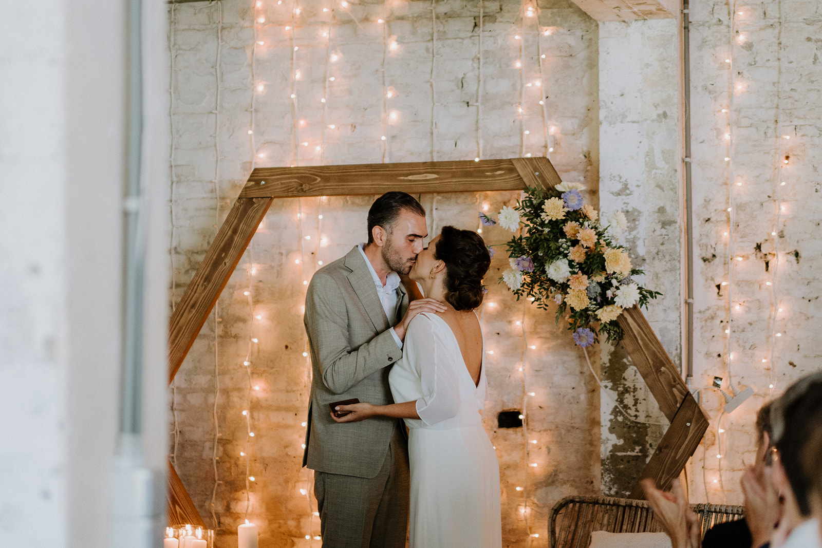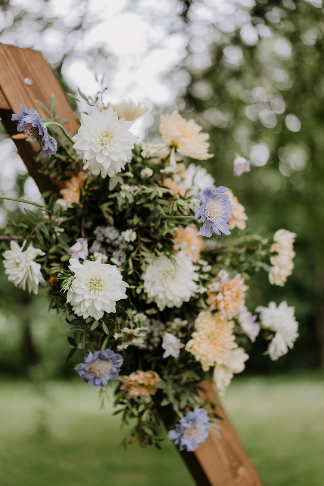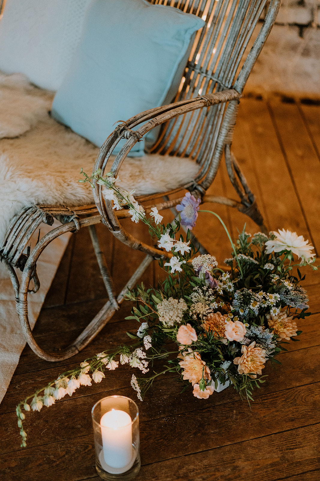 Nina en Johan droomden van een echt midzomerfeest of Midsommar. Denk aan een gezellig tuinfeest met kampvuur, wilde bloemen en eindeloos lang tafelen in de zachte schemering. Hun trouwlocatie,Tombeek Plage & Ateliers, leent zich hier perfect voor: een grote tuin vol hoekjes en kantjes waar je heerlijk kan wandelen, met knoestige appelbomen en een echte vuurplaats. Helaas werkte het Belgische weer niet mee op de dag zelf. Hierdoor moesten we de geplande buitenceremonie last minute verplaatsen naar het industriële atelier binnen. Gelukkig is het daar minstens even sfeervol!