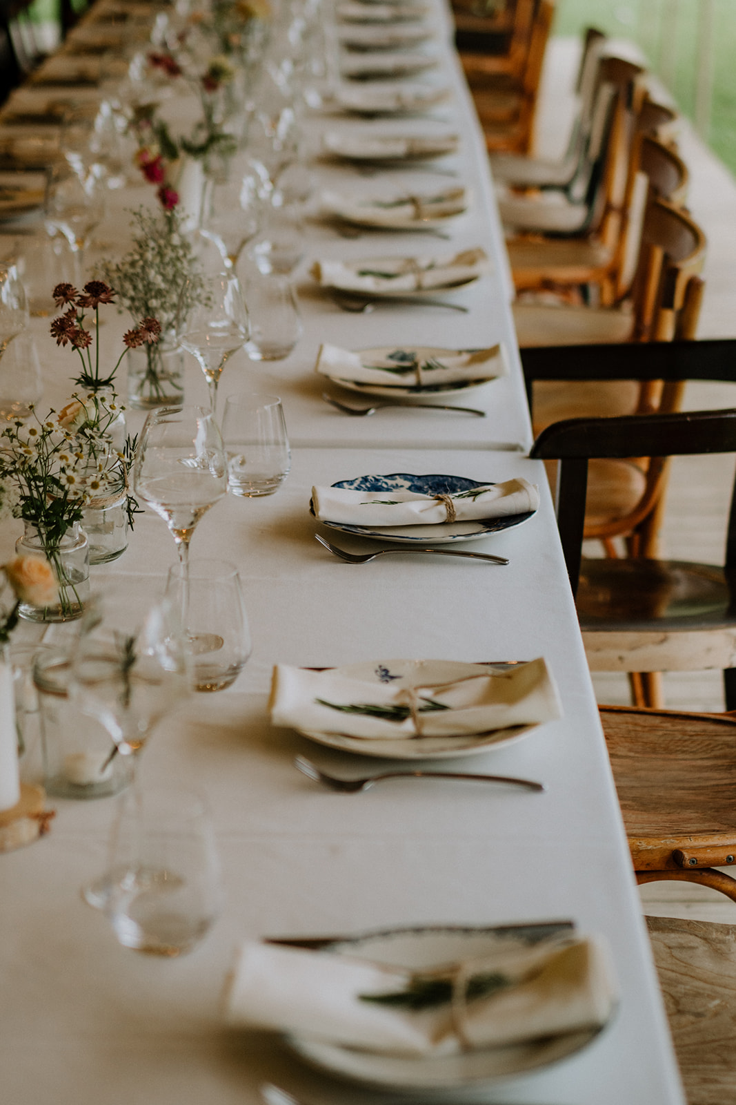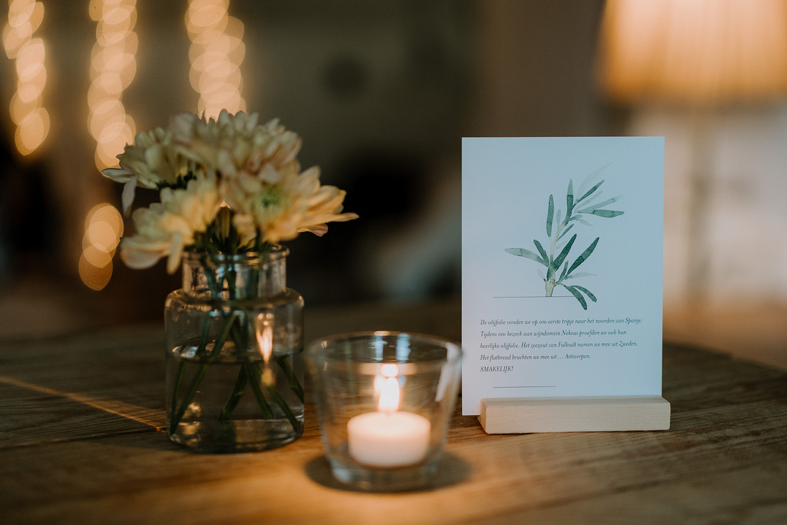 Charlotte van Flower Fest was ook volledig mee met onze visie. Zij zorgde voor de rozemarijntakjes als rode (groene) draad doorheen de dag, van het haarstukje van Nina tot op servetten. En verder moesten we niet al te zot doen qua decoratie. Less is more voor Nina en Johan en dat kwam op hun trouwdag mooi tot uiting.
