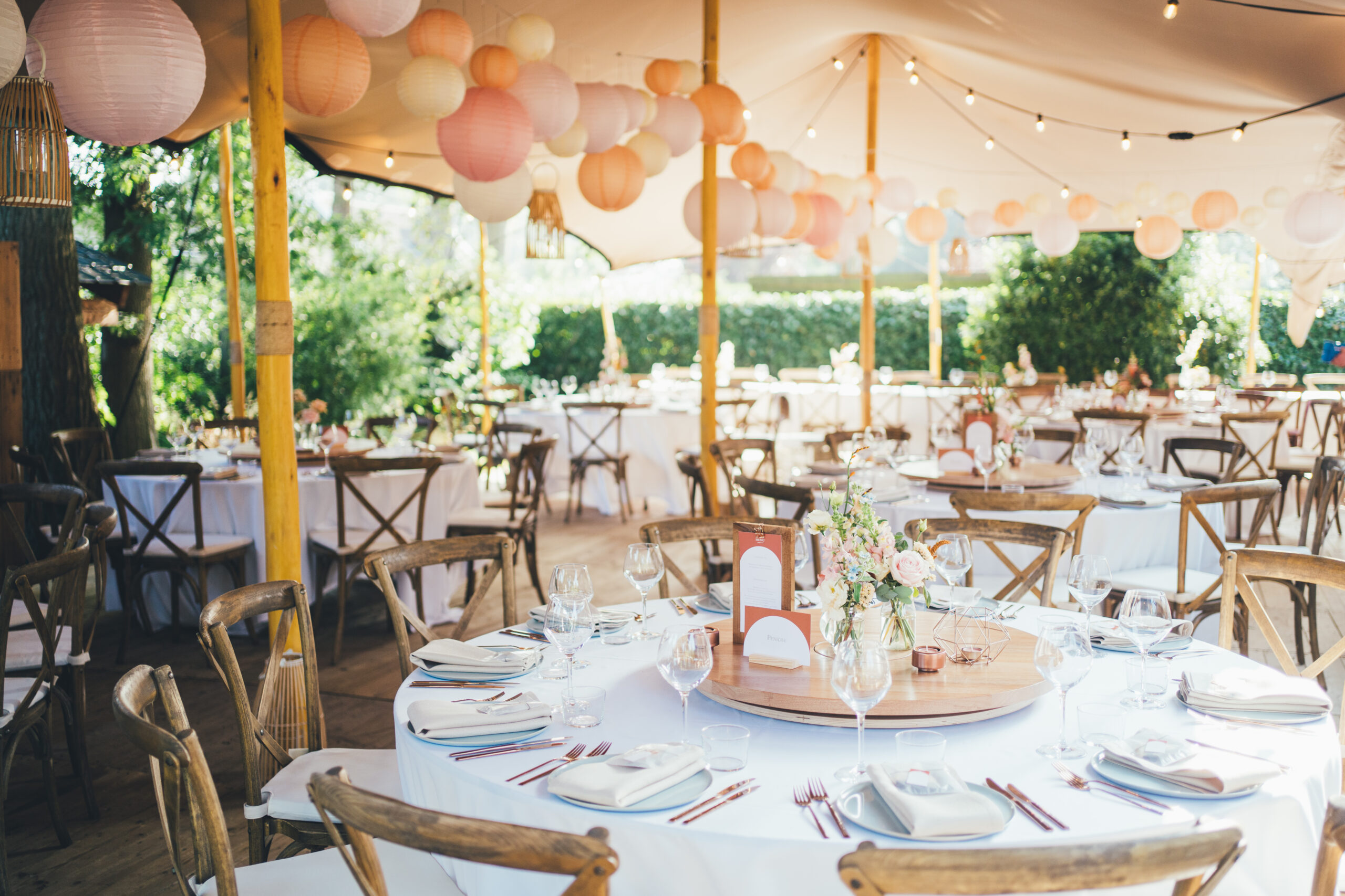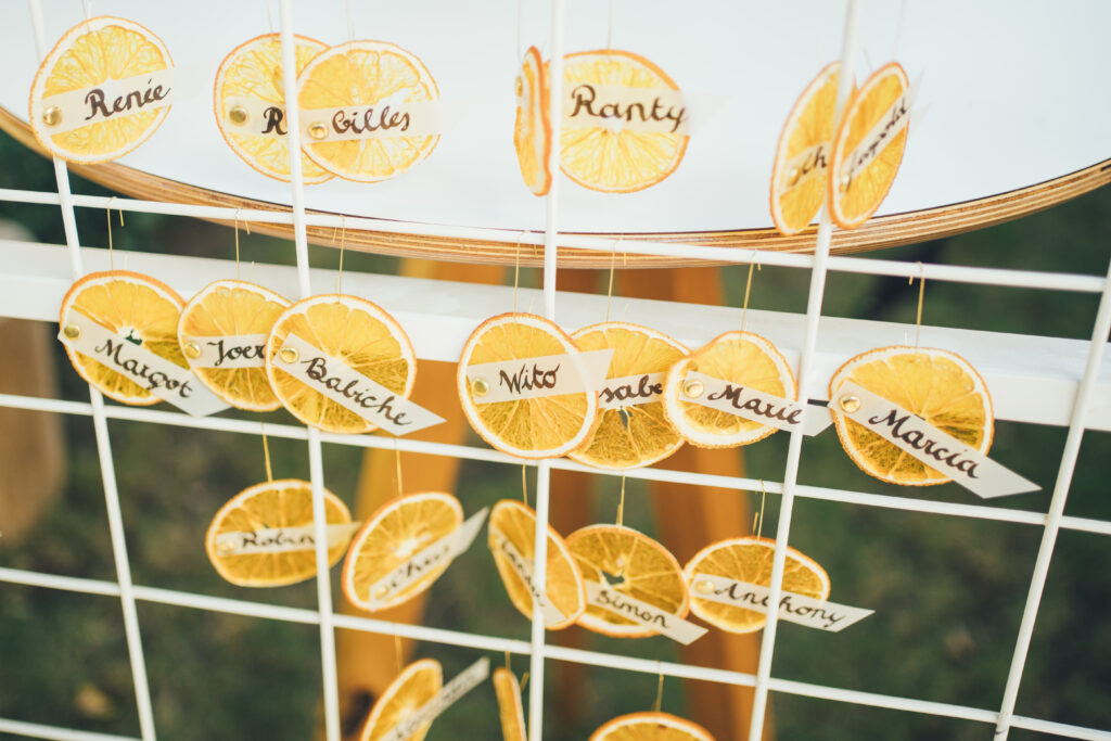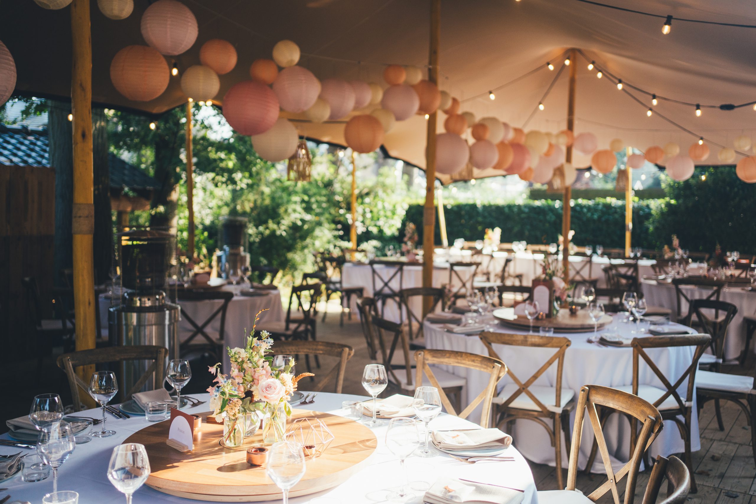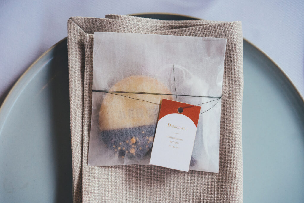 Voor de styling en aankleding van hun trouwdag vertrouwden Charlotte en Arne volledig op Wedding Dreamworx – yes! 🙂 Het kleurenpalet van tinten roze, oranje en terracotta weerspiegelde de warme nazomersfeer. Fijne decoratie-details waren onder andere de vrolijke lampionnen bovenin de tent, de houten draaiplanken op elke tafel voor het sharing dinner, de naamkaartjes van gedroogde appelsienschijfjes en uiteraard de prachtige bloemcreaties van Degroote Bloemen. Bij Sfeerlab en bij Levi vonden we de perfecte items om het thema verder uit te werken en ook lag er voor elke gast een heerlijk koekje van Goegebakken klaar.