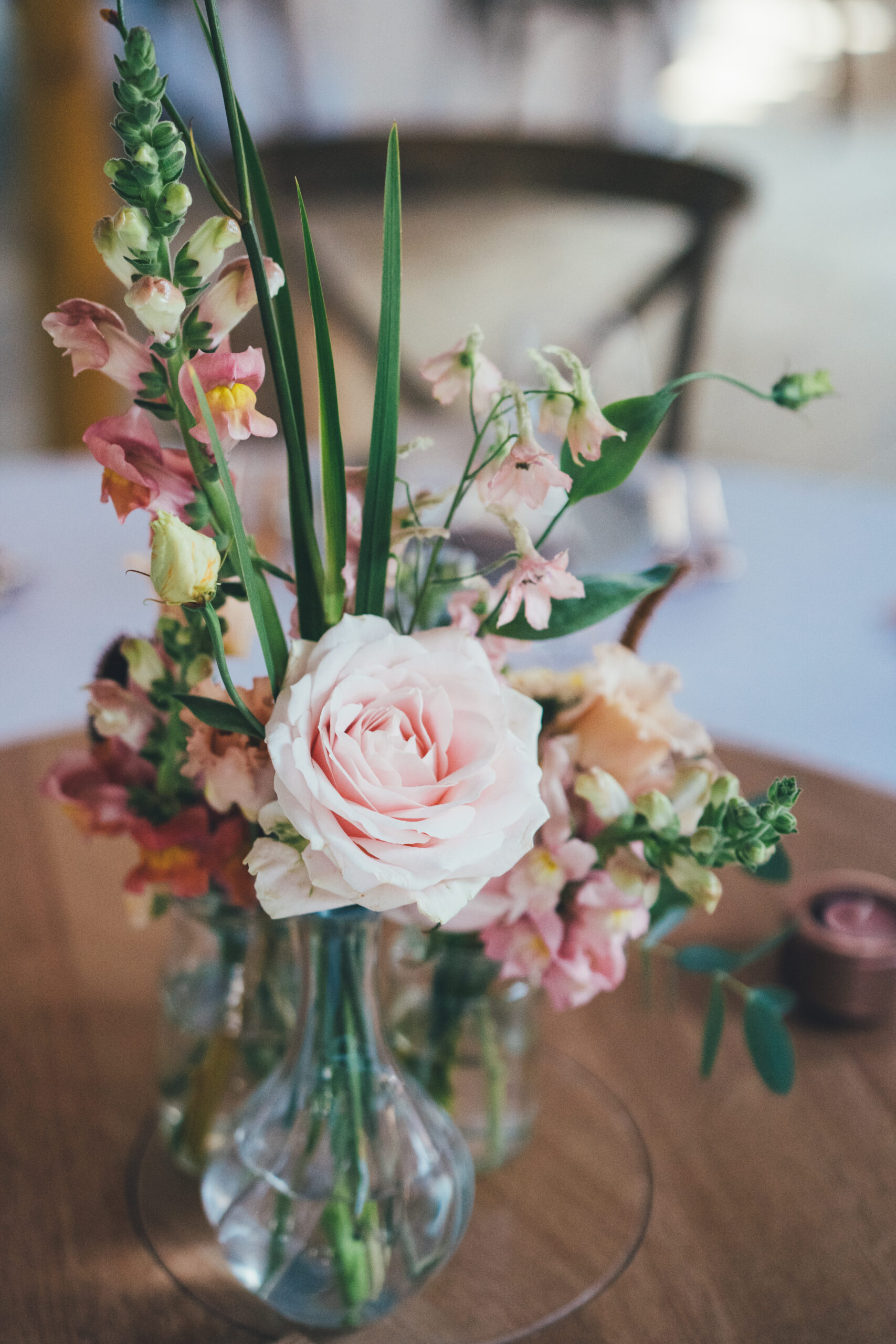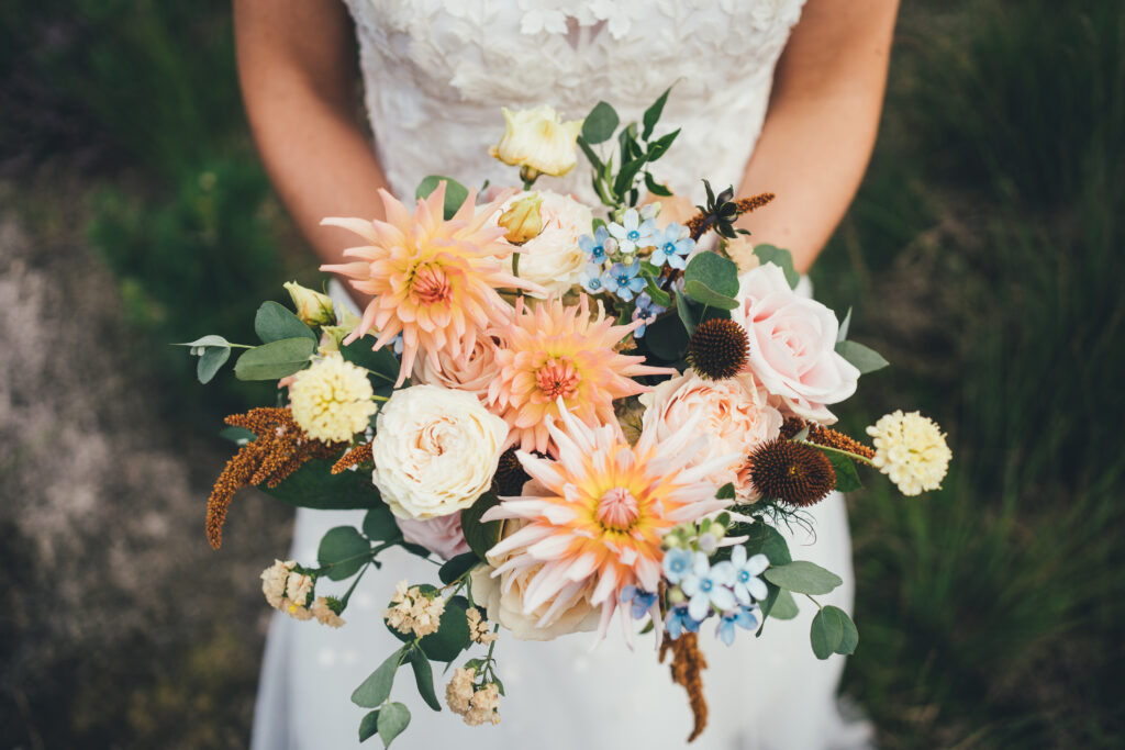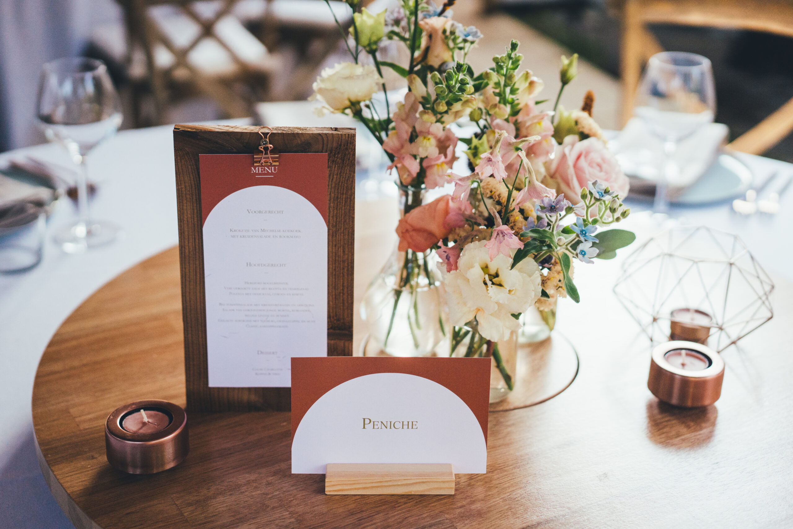 Voor de styling en aankleding van hun trouwdag vertrouwden Charlotte en Arne volledig op Wedding Dreamworx – yes! 🙂 Het kleurenpalet van tinten roze, oranje en terracotta weerspiegelde de warme nazomersfeer. Fijne decoratie-details waren onder andere de vrolijke lampionnen bovenin de tent, de houten draaiplanken op elke tafel voor het sharing dinner, de naamkaartjes van gedroogde appelsienschijfjes en uiteraard de prachtige bloemcreaties van Degroote Bloemen. Bij Sfeerlab en bij Levi vonden we de perfecte items om het thema verder uit te werken en ook lag er voor elke gast een heerlijk koekje van Goegebakken klaar.